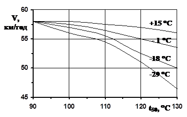 Рис. 1.3 Вплив температури t50 на швидкість автомобіля, що розвиває за 6 с розгону при різних температурах повітря Проте, використання бензину з низькою температурою 50% може привести до зниження коефіцієнту наповнення і потужності двигуна. Знос та економічність роботи двигуна оцінюєтьсятемпературою перегонки 90% (t90% ) і температурою кінця кипіння (tк.к. ), по яким роблять висновок щодо інтенсивності і повноти згорання робочої суміші, про наявність у бензині важких (хвостових) фракцій. При наявності важких фракцій, бензин випаровується не повністю, що призводить до нерівномірного розподілу пальної суміші між циліндрами, розрідження масла і змиву його зі стінок циліндрів, а також до підвищення спрацювання двигуна і витрат палива. Чим менший інтервал температур, від t90% до tк.к. тим якість палива вища (рис. 1.4).