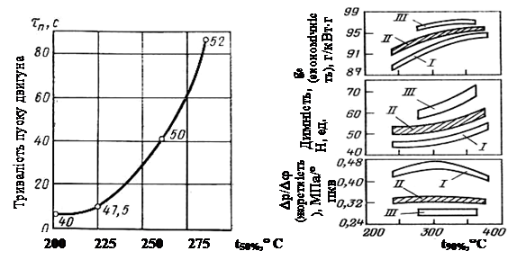 Випаровуваність дизельних палив, у першу чергу, визначають пускові властивості . Пускові властивості дизельних палив залежать від температури википання 50% (t50% ) фракцій. При цьому, цетанове число (якщо воно не надто низьке) впливає на легкість пуску, у меншій мірі, ніж фракційний склад. При запуску двигуна складаються найбільш несприятливі умови для сумішоутворення та самозаймання палива, внаслідок недостатньо високої температури у кінці такту стиску. При цьому велика кількість тепла передається холодним стінкам, а частина стискаємого повітря, при невеликих пускових обертах колінчатого валу, буде прориватися у картер. Ступінь стиску, а, як наслідок, і температура повітря у кінці стиску, будуть нижче порівняно з прогрітим двигуном. Саме тому, випаровуваність має бути такою, щоб у момент самозаймання утворювалася горюча суміш, яка відповідає межам займання. Обважнювання фракційного складу погіршує пускові властивості. Полегшення пуску двигуна з кращою випаровуваністю спостерігається лише до певних меж полегшення фракційного складу, у зв’язку з погіршенням займання (рис. 1.11). Крім того, відбувається перезбагачення суміші поблизу форсунки і збіднення у решті камери згоряння, знову погіршуються пускові характеристики. Температура википання 96% фракцій палива (t96% ), в основному, здійснює вплив на потужності та економічні показники роботи дизеля.