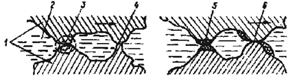 Рис. 5. Особливості тертя: масло без присадки (а) та з хімічно активною присадкою (б); 1 – тертьові поверхні; 2 – масло; 3 – «крапка контакту»; 4 – момент зварювання поверхні деталей; 5 – утворення хімічної плівки; 6 – полірування деталей. Проте, будь-яка високоякісна присадка може бути ефективною тільки у тому випадку, якщо базові масла добре очищені, мають оптимальний вуглеводневий склад. Необхідність застосування в’язкістних і депресорних присадок диктується напруженою роботою двигуна або якістю палива. Доцільність застосування миючих, протиокисних, протизносних та інших присадок тісно пов'язана з конструктивними параметрами двигуна, напруженістю його роботи. Загальними вимогами, незалежно від призначення присадки, є: - якнайбільша ефективність; - спроможність цілком розчиняється у маслах, як при низькій, так і при високій температурі; - відсутність негативного впливу на експлуатаційні властивості масла, які не пов'язані з функціональною дією використовуємої присадки; - мати високу стабільність при зберіганні масла та неминучому в експлуатації контакту з водою; - не випадати в осад і не відфільтровуватись фільтрами тонкого очищення у період роботи. Прийнято класифікувати присадки за трьома загальними ознаками: 1) за видом нафтопродукту, для якого вони призначенні; 2) за функціональним призначенням; 3) за механізмом дії (фізичний, поверхнево-адсорбційний, колоїдно-хімічний). За призначенням присадки можна розділити на такі групи: 1) Індивідуальн і, які покращують одну властивість масла: – в'язкістні присадки, які поліпшують в'язкістно-температурну характеристику (властивості); – депресорні , які знижують температуру застигання масла; – миючі (детергенти) , які не припускають на деталях двигуна нагарів, лаків, осадів; – протиокисн і, які підвищують стабільність масла; – протизадирні , які покращують мастильні властивості масел та охороняють деталі двигуна і трансмісії від задиру; – антикорозійні , які захищають від корозії; – протиспінювальні , які запобігають спінюванню масел при циркуляції у масляних системах. 2) Багатофункціональні , спроможні поліпшити дві або кілька властивості масла. Це фенолсульфідні, полімерні та інші з'єднання, які містять фосфор і сірку. Великий внесок у розробку присадок до масел і з'ясування механізму їх дії внесли дослідження радянських вчених С.Е. Крейна, А.М. Кушева, К.К. Панок, А.Б. Виппера, Ю.С. Засловського і багатьох інших. Вміст та дія присадок Сучасними дослідженнями встановлено, що присадка рідко покращує якість одного показника масла, частіше, поряд з домінуючим основним, присадка виконує і ряд додаткових функцій. Але, звичайно їх класифікують по основній, виконуваній ними функції. Розглянемо коротко найбільш поширені у маслах присадки та їх вміст: мийно – диспергійні (3…20%); протикорозійні (0,1…1,0%); протизадирні та протизносні (5…10%); протиокислювальні (0,005…3%); депресорні (0,1…1,0%); в’язкостні (0,5…10%); протипінні (0,0001…0,001%); антифрикційні (0,5…2,2%); інгібітори корозії (1…10%). В'язкістні присадки (атапол, ИХП-234, КП-5, КП-10, КП-20, ПМА «В-1», ПМА «В-2», вініпол та ін.). Щоб одержати високоякісні масла з високим індексом в'язкості і задовільною прокачуваністю при низьких температурах, недостатньо застосування високоякісної сировини і поліпшення технології нафтопереробки. Значного підвищення цих показників