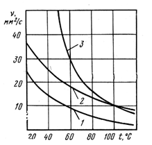Рис. 1. Залежність лужного і кислотного чисел моторного масла та зносу тертьових деталей від пробігу s автомобіля При центробіжному очищенні миючі присадки виводяться з моторного масла менш інтенсивно, ніж фільтрами тонкого очищення. Це пояснюється тим, що відцентрові маслоочисники менш ефективно виділяють з масел асфальтосмолисті речовини, на яких адсорбуються присадки, ніж фільтри тонкого очищення. У висновку слід зазначити, що при роботі двигуна під дією високих температур, тиску та тривалості роботи відбувається зміна фізико-хімічних показників масла: 1) збільшується кількість механічних домішок, які утворюються у перші 60…120 годин роботи, а потім процес стабілізується. Інтенсивне накопичення механічних домішок відбувається за рахунок окислення малостабільних вуглеводнів масла; 2) зростання в'язкості масла на 2,5…3,0 мм2 /с інтенсивне у перші 60…160 годин роботи, а потім стабілізується. Це явище пояснюється випаруванням із масла легкокиплячих малов’язких фракцій і накопичення у ньому поляризованих продуктів окислення; 3) знижується лужність масла за рахунок вигоряння лужних та інших присадок. Причинами зменшення присадки є: 1) адсорбція присадки на фільтрувальних елементах масляних фільтрів; 2) адсорбція присадки на механічних домішках і наступне її видалення разом із домішками системою очищення в двигуні; 3) адсорбція на поверхні деталей; 4) витрата присадки по функціональному призначенню. Великий вплив на вміст присадки у маслі становить якість його зберігання. Відомо, що велика частина присадок не розчинюється у маслі і складає з ним колоїдну систему, яка дуже чуттєва до вологи. Обводнювання масла 0,2% води призводить до порушення колоїдної системи і до випадання присадок в осад (наприклад, через 6 годин випадає в осад 75%). Експлуатаційні властивості моторних масел Моторне масло доцільно розглядати як елемент конструкції вузла, агрегату, двигуна, у якому воно використовується. У цьому випадку на нього поширюються поняття теорії надійності, включаючи і поняття працездатності. Під працездатністю розуміють стан об'єкта, при якому значення всіх параметрів, що оцінюють його спроможність виконувати задані функції, відповідають вимогам нормативно-технічної документації. При оцінці якості масел, використовуються численні фізико-хімічні показники. Досвід застосування масел із присадками дозволяє встановити ряд основних показників, які достатньо повно характеризують працездатність масла. Слід зазначити, що про якість масла можна судити тільки з комплексу показників. Нижче приводяться основні фізико-хімічні та експлуатаційні показники якості моторних масел. В’язкістні властивості В'язкість є однією з основних властивостей мастильних матеріалів. Згідно з гідродинамічною теорією рідинного змащення, в'язкість масел є характеристикою, яка визначає можливість його застосування для даної машини. В’язкість моторних масел, на відміну від більшості інших показників, може змінюватися в сторону, як збільшення, так і зменшення. З підвищенням температур в'язкість масел зменшується, а при зниженні – підвищується. Зміна в'язкості із зміною температур у різних масел відбувається по-різному. Значний вплив на зміну в'язкості має вуглеводний склад. Ароматичні вуглеводні мають гіршу в'язкістно-температурну характеристику, ніж п