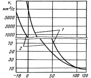 Рис. 2. Залежність в’язкості моторних масел від температури: 1 – індекс в’язкості 90; 2 – індекс в’язкості 100. Перевага загущених масел – у значно кращих низькотемпературних властивостях, що особливо проявляється при запуску двигунів у холодну пору року, коли через підвищення в’язкості різко падає частота обертання і збільшується обертаючий момент (рис. 3.) Все це призводить до виникнення граничного змащення на поверхнях деталей двигуна.