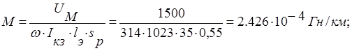 где: ω=314 рад/с – угловая частота влияющего тока; M – взаимная индуктивность между контактной подвеской и проводом связи, Гн/км; Iкз – наибольший ток КЗ, А; lэ – длина сближения, км; sp– коэффициент экранирующего действия рельсов, значение которого при удельной проводимости земли 0,05..0,1 См/м равно 0,55..0,60. Взаимная индуктивность между контактной подвеской и проводом связи определяется по формуле (7):