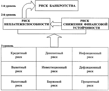 Первый уровень представлен риском банкротства предприятия. Банкротство предприятия, по мнению Бланка, является интегральным риском, так как не только воздействие финансовых рисков может привести к угрозе банкротства. Как считают большинство авторов, все виды рисков: производственные, технические, инновационные, коммерческие - способны привести предприятие к данным плачевным финансовым результатам. Второй уровень многоуровневой классификации финансовых рисков, по нашему мнению, должен быть представлен так называемыми обобщающими рисками. Это следующие виды финансовых рисков: риск снижения финансовой устойчивости и риск неплатежеспособности. По нашему мнению, данные виды финансовых рисков могут генерироваться в риск банкротства. Третий уровень составляют конкретные финансовые риски. Данные виды рисков сопряжены с конкретными видами деятельности предприятия. Рассматривая различные классификации финансовых рисков, по нашему мнению, можно выделить следующие конкретные финансовые риски: инвестиционный риск, инфляционный риск, дефляционный риск, процентный риск, депозитный риск, валютный риск, кредитный риск, налоговый риск, биржевой риск. В табл. 3 представлены конкретные финансовые риски и примеры их проявления [2]. Таблица 3 Финансовые риски и их проявление
