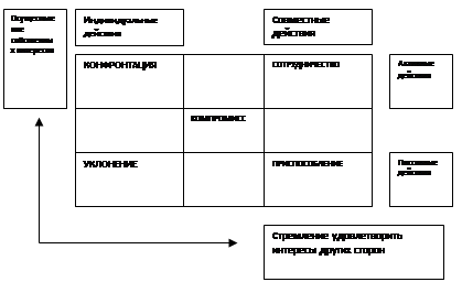 Чем же отличается каждый из названных стилей поведения в конфликтах? Уклонение как стиль поведения в конфликтах характеризуется явным отсутствием у вовлеченного в конфликтную ситуацию желания сотрудничать с кем-либо и приложить активные усилия для осуществления собственных интересов, равно как пойти навстречу оппонентам; стремлением выйти из конфликтного поля, уйти от конфликта. Такой стиль поведения обычно выбирают в тех случаях, когда: - проблема, вызвавшая столкновение, не представляется субъекту конфликта существенной, предмет расхождения, по его мнению — мелочный, основан на вкусовых различиях, не заслуживает траты времени и сил; - обнаруживается возможность достичь собственных целей иным, неконфликтным путем; - столкновение происходит между равными или близкими по силе (рангу) субъектами, сознательно избегающими осложнений в своих взаимоотношениях; - участник конфликта чувствует свою неправоту или имеет оппонентом человека, обладающего более высоким рангом, напористой волевой энергией; - требуется отсрочить острое столкновение, чтобы выиграть время, более обстоятельно проанализировать сложившуюся ситуацию, собраться с силами, заручиться поддержкой сторонников; - желательно избежать дальнейших контактов с трудным по психическому состоянию человеком или крайне тенденциозным, чрезмерно пристрастным оппонентом, преднамеренно ищущим поводы для обострения отношений [3]. Приспособление как стиль пассивного поведения отличается склонностью участников конфликта смягчить, сгладить конфликтную ситуацию, сохранить, или восстановить гармонию во взаимоотношениях посредством уступчивости, доверия, готовности к примирению. В отличие от уклонения этот стиль предполагает в большей мере учитывать интересы оппонентов и не избегать совместных с ними действий. Обычно приспособлению дают выход в тех ситуациях, когда: - участник конфликта не очень-то озабочен возникшей проблемой, не считает ее достаточно существенной для себя и потому проявляет готовность принять во внимание интересы другой стороны, уступая ей, если обладает более высоким рангом, или приспосабливаясь к ней, если оказывается рангом ниже; - оппоненты демонстрируют сговорчивость и намеренно уступают друг другу в чем-то, считаются с тем, что, мало теряя, приобретают больше, в том числе добрые взаимоотношения, обоюдное согласие, партнерские связи; - создается тупиковая ситуация, требующая ослабления накала страстей, принесения какой-то жертвы ради сохранения мира в отношениях и предупреждения конфронтационных действий, не поступаясь, конечно, своими принципами, в первую очередь нравственными; - имеется искреннее желание одной из конфликтующих сторон оказать поддержку оппоненту, при этом чувствовать себя вполне удовлетворенным своей добросердечностью; - проявляется соревновательное взаимодействие оппонентов, не направленное на жесткую конкуренцию, непременное нанесение ущерба другой стороне [3]. Конфронтация по своей направленности ориентирована на то, чтобы, действуя активно и самостоятельно, добиваться осуществления собственных интересов без учета интересов других сторон, непосредственно участвующих в конфликте, а то и в ущерб им. Применяющий подобный стиль поведения стремится навязать другим свое решение проблемы, уповает только на свою силу,