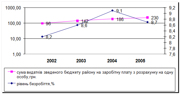 Рис. 3.1 Динаміка капітальних видатків з місцевого бюджету у складі капітальних інвестицій в економіку Ізяславського району (2002-2005 роки) Обсяг бюджету розвитку у 2005 році (складає 1,7% у зведеному бюджеті Ізяславського району) є недостатнім для того, щоб здійснювати вагомий вплив на покращення ситуації економіки. Слід зазначити, що видатки розвитку були спрямовані на капітальні ремонти та інші заходи, не пов’язані із інвестиційною діяльністю, а вкладення в інвестиції відбувалося залишковим принципом, і є невиправданим та не сприяє тому, щоб створювались належні передумови для підвищення потенціальних можливостей району, та створення передумов для поповнення дохідної частини бюджету у майбутньому. Отже, можна зробити висновок, що залежність обсягів місцевих бюджетів від центральної влади не дає ніякої можливості для прийняття самостійних рішень на місцях щодо інвестицій у сферу економіки. Разом з тим, пожвавлення інвестиційної діяльності внутрішніх інвесторів ще не має значного впливу на забезпечення сталого розвитку економіки, а обсяги інвестування не відповідають їх потребі. Структура внутрішніх інвестицій вказує на практичну вичерпність стимулюючих факторів до їх нарощення. Основним джерелом інвестицій, як і раніше, залишаються власні кошти підприємств і організацій: їх частка у загальному обсязі становить близько 65-70 %. Нажаль, через дефіцит фінансових ресурсів значного практичного впровадження розробка бюджетів розвитку в Україні не здобула. Реалізація бюджетних програм розвитку залишається переважно на папері. Єдине, на що розраховують органи місцевої влади – це отримати частину інвестиційної субвенції, яка надходить областям з держбюджету. Розглядаючи такі показники, як рівень безробіття в Ізяславському районі за період 2003-2005 роки та сума видатків зведеного бюджету району на одну особу(рис.3.2), можна зробити висновки, що рівень управління місцевими органами підконтрольними їм ресурсами є досить низьким. Дані свідчать, що сума видатків на заробітну плату з розрахунку на одну особу зросла за період з 2002 по 2005 роки у 2,3 рази, разом з тим рівень безробіття також зріс на 0,5%. Отже, звідси видно, що не вкладаються кошти районного бюджету, в необхідному обсязі у розвиток економічного потенціалу району та у створення нових робочих місць.
