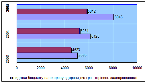Рис.3.2 Динаміка показників видатків зведеного бюджету на заробітну плату з розрахунку на одну особу та рівня безробіття по Ізяславському районі в 2002-2005 роках Потенціал бюджету розвитку має бути розширеним за рахунок різних джерел наповнення таких, як податкові та неподаткові надходження, що спрямовуються на фінансування інвестиційних програм; надходжень від приватизації; внутрішніх та зовнішніх запозичень, які б спрямовувались у інвестиції; частиною доходів від власності та підприємницької діяльності. Саме тому для покращення ситуації, що склалася для органів влади доцільно було б передбачити у місцевому бюджеті кошти на розвиток економічного потенціалу району, створення нових робочих місць, що могло б стати поштовхом до додаткових бюджетних надходжень. Отже, на сьогодні перед органами місцевого самовврядування стоять такі проблеми як: 1) Диспропорції у рівні соціально-економічного розвитку міста та сільських територій. 2) Недостатність фінансових та регуляторних стимулів для активізації економічної діяльності на місцях. 3) Низький рівень життя населення та соціального розвитку сільських населених пунктів. 4) Нерівномірність розвитку малого бізнесу у територіальному розрізі. 5) Низький рівень розвитку інфраструктури, зокрема транспортної та комунальної, що створює недостатню інвестиційну привабливість територій. 6) Низькі темпи будівництва житла, зношеність об’єктів систем водо-, теплопостачання та водовідведення. Разом із всіма іншими функціями, бюджет є гарантом та засобом задоволення суспільних потреб населення відповідної території. Отже, бюджет безпосередньо впливає на соціальний розвиток адміністративного району, але на сучасному рівні розвитку від змушує чекати кращого. Аналізуючи стан, який склався у фінансуванні соціально-культурних закладів, треба зазначити, що в цій сфері необхідно провести певні зміни. Система бюджетно-кошторисного фінансування установ невиробничої сфери, яка склалася за багато десятиліть, має серйозні недоліки, які потрібно виправляти. Та при здійсненні рішучих дій потрібно враховувати такі фактори, як врахування потреб та особливостей окремих територій, включення соціальних нормативів у систему макроекономічних показників (рівня зайнятості, прожиткового мінімуму, рівня бідності та товарообороту). Також першочерговим обов’язком держави у соціальній сфері є підвищення мінімальної заробітної плати до рівня прожиткового мінімуму. Ці зміни можуть мати місце завдяки припиненню надмірної диференціації доходів населення. Вплив місцевих бюджетів на соціальний розвиток адміністративного району можна прослідкувати на прикладі співвідношення розміру середньомісячної заробітної плати та суми видатків зведеного бюджету району на заробітну плату за 2002-2005 роки.(рис.3.4) Таким чином, із підвищенням витрат з бюджету на цю статтю видатків, збільшується рівень заробітної плати і тим самим сукупний дохід громадян. За даними аналізу в Ізяславському районі переважають видатки на освіту – 39,7% в загальній сумі видатків та на охорону здоров’я – 17,9% в загальній структурі видаткової частини. Але незважаючи на те, що видатки на охорону здоров’я за останні роки (2003-2005 роки) зросли майже у півтора рази, рівень захворюваності збільшується з кожним роком, як видно з рисунку3.5. Це повязано і