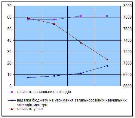Рис.3.5 Співвідношення показників видатків бюджету району на охорону здоров’я та захворюваності населення в Ізяславському районі за 2003-2005 роки Розглядаючи обсяг витрат бюджету Ізяславського району на утримання закладів освіти (рис. 3.6.) можна зробити висновок, що за останній рік обсяг витрат зріс у 0,5 рази, при незмінній кількості навчальних закладів. Отже, стан стабільний і в місцевих бюджетах достатньо коштів для утримання такого роду закладів. Цього вдалося досягти завдяки щорічному збільшенню фінансування на утримання цих закладів. За період з 2002 по 2005 роки фінансування зросло майже у два рази.