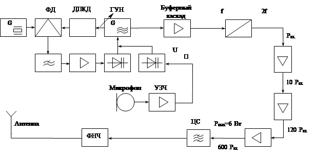 Исходя из ширины спектра ЧМ сигнала в данном случае, выбираем шаг сетки частот на выходе передатчика равным 50 кГц. Тогда с учётом коэффициента умножения частоты шаг сетки частот ГСЭЧ должен составить » 25 кГц. Допустим, что у нас возбудитель «ПКВ – 250» у которого диапазон генерируемых частот 4…27 МГц с шагом сетки частот 100 Гц, нестабильность частоты порядка 2×10-7 (хотя в нашем случае, по техническому заданию достаточно обеспечить нестабильность частоты на выходе передатчика 10-5 ), напряжение на выходе 1 В при работе на нагрузку 75 Ом (см. [3], стр. 261, табл. 8.6). Тогда получается, что мощность на выходе ГУН порядка 10 мВт. Выходная колебательная мощность нашего связного ЧМ передатчика по техническому заданию должна быть 6 Вт, следовательно, входной сигнал передатчика необходимо по мощности усилить в 600 раз. Оконечный же мощный каскад передатчика в соответствии с расчётами, (см. раздел 3.3 РАСЧЁТ БАЗОВОЙ ЦЕПИ) может обеспечить коэффициент усиления по мощности порядка Кр » 5,119. Значит, необходимо обеспечить коэффициент усиления по мощности как минимум ещё в 115…120 раз, допустим, что в 120 раз (возьмём с запасом), тогда перед оконечным каскадом необходимо поставить ещё два усилительных каскада, например, на выбранном транзисторе 2Т951А (см. раздел 3.1 ВЫБОР УСИЛИТЕЛЬОГО ПОЛУПРОВОДНИКОВОГО ПРИБОРА) c Кр равными 10 и 12 соответственно. После проведённых рассуждений, проводимых с целью обозначить необходимые составные части и объяснить назначение этих частей в структурной схеме, предлагается структурная схема связного передатчика с ЧМ, вид которой показан на рисунке 2.4 :