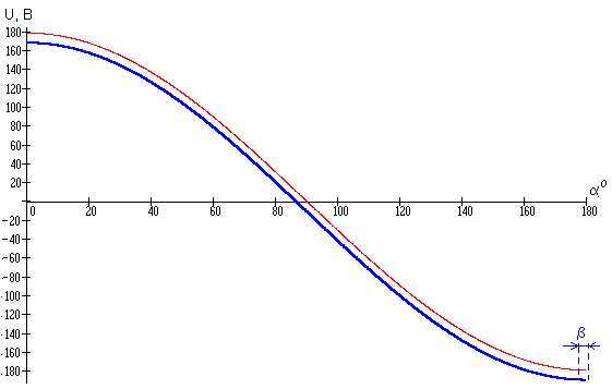 График выпрямленного напряжения на якоре электродвигателя при номинальном токе нагрузки в функции a строится по соотношению: