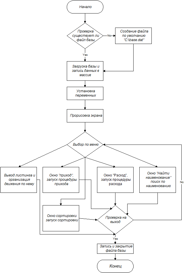 ВВедение. Данная программа автоматизированного рабочего места разработана для работников складских помещений, естественно если у них имеется компьютер классом не ниже Pentium. Сейчас на рынке программного обеспечения появляются все больше и больше различных программ для работы не только со складом, но и различные другие программные средства автоматизированного рабочего места, но стоимость их лицензионных копий доходит порой до нескольких десятков тысяч, а моя программа может быть конечно маленько еще «сыровата», но в процессе работы с нею её можно «довести ее до ума» и все это лишь за пятерку по программированию цена не велика за произведение программного искусства. Каковы её плюсы: ну это естественно простота и понятность (для русского человека) интерфейса программы, что не требует дополнительного обучения или прохождения специальных курсов, особенно для женщин, работающих на складах и не посвященных в азы компьютеров и программного обеспечения; не требовательность к системным ресурсам машины; легкость ввода и отслеживания; простота резервирования базы данных (всего 1 файл), что не маловажно для такой программы. При написании и разработке курсового проекта я научился работать с Borland Pascal, Microsoft Windows 95OSR2, Microsoft Word 97 SR-2 которые использовались для работы над курсовым проектом, научился использовать справку и другие функции Borland Pascal при этом даже разобрался с английским языком и использованием электронных словарей переводчиков таких как Promt, Stylus, Magic Gooddy 98. Огромное спасибо Волкову А.И. – за отличное преподавание предметов, Billу Gaits – за то что он умеет зарабатывать деньги собственным умом, Мерзлякову Д.С. – за поддержку в трудную минуту, Барышеву А.А. – за техническую поддержку, Русских А.И. – за программную поддержку, Казакову В.С. – за разрешение работать на компьютере, Sting, Queen, и другим за хорошую музыку во время работы над курсовым. I. Задание. Составить программу автоматического рабочего места для работы со складом. Программа должна предоставлять пользователю возможность: 1. Вводить новый товар, указывая следующие параметры -Наименование; -Количество; -Цену; -Дату поступления. 2. Осуществлять поиск товара по наименованию и выдавать его параметры. 3. Помечать выбывший товар, указывая дату выдачи. 4. Выводить список имеющегося товара с возможностью сортировки по любому параметру. 5. Выводить список выбывшего товара с возможностью сортировки по любому параметру. 6. Выдавать общую статистическую характеристику: -Общая стоимость имеющегося товара; -Количество имеющегося товара; -Количество выбывшего товара. 7. Сохранять и восстанавливать всю информацию АРМ с диска. II. описание переменных и алгоритма работы программы. Описание переменных. -basskl – основная запись с необходимыми переменными это: -naim – наименование товара; -kol – количество товара; -price – цена товара; -kol_p – количество пришедшего товара; -kol_r – количество товара который ушел; -date_p – дата прихода товара; -date_r – дата расхода товара. -f – file базы слада; -list – массив данных базы; -schet – cчетчик; -curs – показатель позиции; -stran – счетчик позиции курсора; -i – переменная использования; -mcurs – переменная начальной позиции меню; -k –переменная определения клавиши; -res –переменная выбора меню; -da – переменная использования; -er – переменная ошибки преобразования; -tx – переменная текста при по
