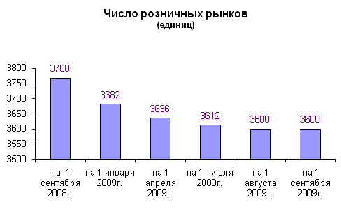 В сентябре 2009 г. по сравнению с предыдущим месяцем в коммерческих организациях розничной торговли, не относящихся к субъектам малого предпринимательства, отмечалось увеличение объемов продажи из продуктов питания - крупы и фруктов (на 12%), рыбы и морепродуктов, муки, овощей и картофеля, сухих молочных консервов (на 4-6%), снижение - продуктов и консервов из мяса, сахара (на 6-9%); из непродовольственных товаров - возросла реализация компьютеров, холодильников и морозильников, стиральных машин, фармацевтических, медицинских и ортопедических товаров, книг, газет и журналов, мобильных телефонов (на 5-11%), а сократилась продажа мебели и строительных материалов - соответственно на 8% и 9%. Качество товаров, поступивших на потребительский рынок В I полугодии 2009 г. органами Роспотребнадзора проведено 56,0 тыс. проверок торгующих организаций, было выявлено 35,7 тыс. административных правонарушений: 49,4% - по статье "нарушение правил продажи отдельных видов товаров"; 32,5% - "нарушение иных прав потребителей"; 5,1% - "продажа товаров, выполнение работ либо оказание услуг при отсутствии установленной информации либо без применения контрольно-кассовых машин"; 4,3% - "обман потребителей"; 2,5% - "нарушение правил продажи спирта, алкогольной продукции и спиртосодержащей"; 2,3% - "невыполнение в срок законного предписания". К административной ответственности привлечено 29,3 тыс. правонарушителей. Сумма взысканных штрафов с правонарушителей составила 36,4 млн.рублей (68,3% от общей суммы наложенных штрафов). Анализ тенденций в сегменте розничных рынков в сентябре 2009 года На 1 сентября 2009 г. на территории Российской Федерации функционировало 3600 розничных рынков. За период с начала отчетного года (по сравнению с 1 января 2009 г.) их число сократилось на 82 рынка, причем, если в I квартале было закрыто (преобразовано в торговые центры) 46 рынков, во II квартале – 24 рынка, то за два месяца III квартала – 12 рынков. Диаграмма: