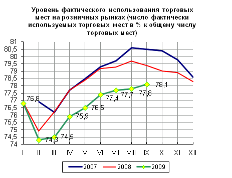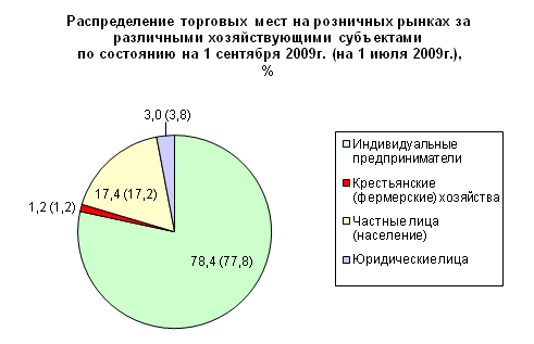 В целом по Российской Федерации за частными лицами (населением) на 1 сентября 2009 г. было закреплено 173,0 тыс. торговых мест. По сравнению с 1 июля 2009 г. количество мест, выделенных этим хозяйствующим субъектам, сократилось на 467 мест (0,3%). Коэффициент их использования по сравнению с 1 июля 2009 г. увеличился с 65,5% до 66,4% .