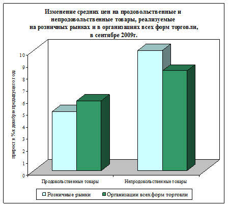 В сентябре 2009 г. оборот розничной торговли на 85,9% формировался торгующими организациями и индивидуальными предпринимателями, осуществляющими деятельность вне рынка, доля розничных рынков и ярмарок составила 14,1% (в сентябре 2008 г. - соответственно 86,6% и 13,4%). Оборот розничной торговли торгующих организаций и продажа товаров на розничных рынках и ярмарках - Диаграмма: