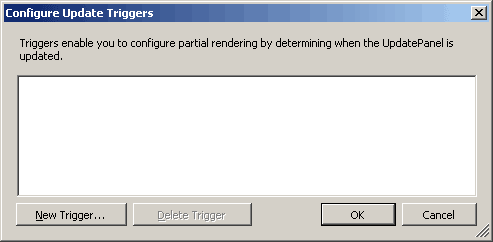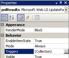 Теперь изменим код нашей формы таким образом, чтобы Repeater, отображающий результаты поиска, оказался внутри UpdatePanel: <atlas:UpdatePanel ID="pnlResults" runat="server"> <ContentTemplate> <asp:Repeater ID="lstResult" runat="server"> … </asp:Repeater> </ContentTemplate> </atlas:UpdatePanel> Теперь укажем этому контролу, реакцией на какое событие на форме будет обновление панели. Для этого перейдем в режим дизайна формы и найдем свойство Triggers у UpdatePanel: