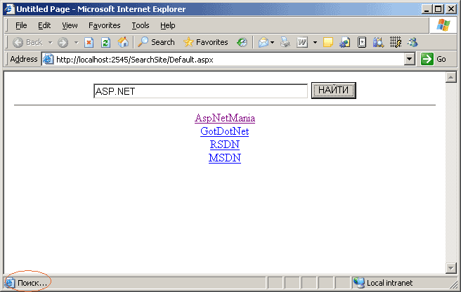 Глянем, как же выглядит результирующий html. Интересным для нас будет следующий код: <script type="text/xml-script"> <page xmlns:script="http://schemas.microsoft.com/xml-script/2005"> <components> <control id="tbSearch"> <behaviors> <autoComplete serviceURL="SearchService.asmx" serviceMethod="GetAutoCompleteList" /> </behaviors> </control> </components> </page></script> Мы видим, что это тот же самый блок, сгенерированный ScriptManager-ом, но с заполненным тэгом <controls>. Таким образом, мы отметим еще одну важную архитектурную особенность Atlas: все Atlas контролы рендерятся в некий xml, за размещение которого отвечает ScriptManager. Реализация формы: вывод результатов запроса. Для вывода результатов запроса мы воспользуемся контролом, играющим важную роль в концепции Atlas. Речь идет об UpdatePanel. Этот контрол реализует функциональность по частичному рендерингу и постбэку формы. Используя его вы можете "перерисовывать" только часть формы, экономя на трафике и, что самое важное, сохраняя состояние контролов формы и значения javascript-переменных. В нашем случае мы будем выводить результаты поиска, не перегружая всю форму целиком, а только ту ее часть, которая будет отображать выборку. Для того, чтобы продемонстрировать, насколько это просто делается, сначала реализуем логику обработки поискового запроса в классическом postback-стиле, а затем воспользуемся UpdatePanel. Будем выводить результаты поиска в обычный Repeater: <asp:Repeater ID="lstResult" runat="server"> <ItemTemplate> & nbsp; <div> & nbsp; <a href='<%# Eval("URL") %>'> <%# Eval("Name")%> & nbsp; </a> & nbsp; </div> </ItemTemplate> </asp:Repeater> В обычный серверный обработчик нажатия кнопки добавим следующий код: protected void btnSearch_Click(object sender, EventArgs e) { lstResult.DataSource = GetSearchResult(); lstResult.DataBind(); } Где GetSearchResult() – метод возвращающий результаты поиска. Для того, чтобы убедиться, что форма перегрузилась целиком, добавим следующий код в класс формы: public void Page_Load() { btnSearch.Attributes["onclick"] = "window.status='Поиск...'"; } То есть, при нажатии на кнопку, в строку статуса браузера пропишется некое значение. Но так как страница целиком перегрузится, состояние строки статуса браузера утратиться. Запускаем и убеждаемся в этом: