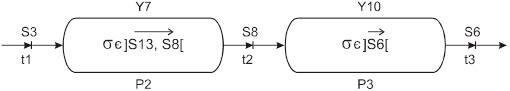 Рисунок 1 – Участок сети Петри. На рисунке показан участок сети Петри а именно захват роботом детали. Вершины графа в виде черточек и обозначенных "t" с последующим номером, называются переходами. Рi – позиция, в обозначении которых указывается от какого и до какого состояния происходит последующий переход. На переходах указывают состояния датчиков, которые позволяют произвести переход. В данном примере переход из позиции Р3 в позицию Р4 переходит по появлению сигнала с датчика S6, после чего привод Y10 отключается, т.е. происходит зажим детали. После построения сети Петри проверяем нет ли в ней "тупиковых" ситуаций. Сеть составлена так, что переход из одного состояния в другое имеет однозначные условия перехода, поэтому "тупиковых" ситуаций нет. В данной сети Петри в каждой ее позиции в любой момент времени может находиться не более одной точки. Следовательно сеть Петри является правильной. 4.1 Построение дерева иерархии Построение дерева иерархии производим по следующему алгоритму: на верхнем уровне этого дерева находится автоматизированный комплекс, который обозначается Р0. На более низком уровне находятся устройства, составляющие АК, которые оберегаются Р1 … Р4. Ниже показывают операции, которые эти устройства производят и обозначают Р5 … Р12. В схеме дерева иерархии приняты следующие обозначения: Р0 – автоматизированный комплекс, Р1 – станок, Р2 – робот, Р3 – транспортер, Р4 – бункер, Р5 – загрузка – выгрузка станка станочными механизмами, Р6 – обработка детали, Р7 – загрузка станка роботом, Р8 – выгрузка станка роботом, Р9 – подача детали к роботу, Р10 – отвод детали, Р11 – загрузка станка станочными механизмами, Р12 – выгрузка станка станочными механизмами, 4.2 Построение сложной сети Петри и расчет дублеров Из операций, описанных выше можно построить сложную сеть Петри в виде последовательно соединенных дублеров. Сложная сеть Петри состоит из дублеров di, номер которого соответствует позиции Pi дерева иерархии. Дублеры обозначаются двойным кружком. Сложная сеть Петри соответствует следующему алгоритму: По кнопке "Пуск" (переход t0) происходит загрузка станка роботом (дублер d7); затем происходит загрузка станка станочными механизмами (дублер d11); После этого по переходу t2 происходит обработка детали (дублер d6); далее происходит выгрузка детали станочными механизмами (дублер d12); потом происходит выгрузка станка роботом (дублер d8); после чего происходит отвод детали (дублер d10); и далее цикл повторяется. 5. Построение расчетно-контактной схемы По описанию алгоритма запишем формулы для механизмов РК.