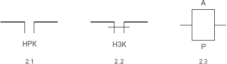 На основе формул строим РКС. Умножение записываем в виде последовательной цепи, а сложение в виде параллельного соединения. Нормально разомкнутые контакты показаны на рисунке 2.1, что соответствует прямому сигналу, нормально замкнутые контакты показаны на рисунке 2.2, что соответствует инверсному состоянию датчиков. Механизм обозначаем релейным объектом 2.3.
