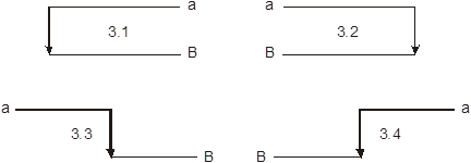 Рисунок 3 – Варианты воздействия датчиков на исполнительные элементы. (3.1 – Случай, когда появление сигнала датчика а приводит к появлению сигнала с исполнительного устройства В 3.2 – Исчезновение сигнала с датчика а приводит к прекращению работы с исполнительного органа В; 3.3 – Исчезновение сигнала с датчика а приводит к началу работы исполнительного органа В; 3.4 – Появление сигнала с датчика а приводит к прекращению работы исполнительного органа В). Все временное пространство работы комплекса разбивается на такты. Под тактом подразумевается период, в течении которых в схеме не изменяется состояние ни одного из сигналов. На основе вышесказанного строится циклограмма, которая приведена на листе 2 приложения А. 7. Проверка составления РКС 7.1 Проверка по циклограмме Данная проверка включает в себя еще три проверки. При первой анализируются, существуют ли записанные ранее условия срабатывания в течении всего включающего периода.