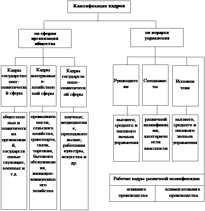 Объект кадровой политики (рис.1.1)характеризуется различными понятиями и определениями, как термин "человеческий фактор", обозначающий совокупность различных отношений, которые складываются при участии людей в процессе создания жизненных благ, "кадры", под которыми понимают только постоянных и только квалифицированных работников, термины "человеческие ресурсы", "трудовые ресурсы", "рабочая сила", "персонал". Человеческие ресурсы являются, обобщающим, итоговым показателем человеческого фактора, а кадры есть социально-экономическая категория, характеризующая человеческие ресурсы конкретного предприятия, региона, страны. Под объектом кадровой политики, следует понимать именно человеческие ресурсы, которые представляют собой совокупность различных качеств людей, определяющих их общую трудоспособность к производству материальных и духовных благ. Кадры представляют собой и объект, и цель кадровой политики, реализация которой предполагает формирование, распределение и рациональное использование квалифицированных работников, занятых в производственных и непроизводственных отраслях общественного производства, т. е. собственно кадров. Кадры – понятие одновременно собирательное и многоуровневое. Собирательное потому, что объединяет работников различных отраслей деятельности, профессий, специальностей, видов труда (хозяйственные, научные, медицинские, преподавательские, военные). Принадлежность работника к той или иной отрасли дает лишь наиболее общее представление о его положении в общественном разделении труда, выполняемых функциях и профессиональных качествах. Многоуровневое означает, что состав кадров отражает, как структуру органов социального управления, так и иерархию работников внутри предприятий учреждений и организаций. С этой точки зрения различают такие категории работников , как руководители, специалисты, исполнители. Руководящий персонал можно ранжировать на руководителей высшего, среднего и низового звеньев; специалисты могут быть дифференцированы по уровню квалификации, категорийности, классности, исполнители по признаку подчиненности. Эта классификация касается и рабочих кадров , которые подразделяются на рабочих основного и вспомогательного производства и имеют различную квалификацию . Эта классификация носит детальный характер, отражает различия в содержании труда и имеет ярко выраженный социальный характер (различные социальные роли и статусы, степени квалификации, уровни доходов, условия труда). Классификация кадров по основным сферам организации общества и основным уровням управления приведена на (рис. 1.1). С точки зрения социальной роли и правового положения различают следующие основные прослойки кадров управления : · политические деятели и кадры общественных и политических организаций; · государственные служащие, т. е. аппарат органов государственной власти управления; · кадры хозяйственные, научные, медицинские, преподавательские, т. е. основные профессиональные работники отдельных отраслей хозяйства, культуры, науки, просвещения, здравоохранения. Порядок комплектования штатов общественных организаций,