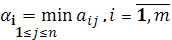 1) Перед игроком P1 стоит задача выбора чистой стратегии, в результате применения которой он получит максимально возможный гарантированный выигрыш. Если игрок P1 выбрал стратегию матрицы, в зависимости от выбранной стратегии игроком P2. Предполагая поведение игрока P1 крайне осмысленным, необходимо считать, что игрок P2 сыграет наилучшим для себя образом и на выбор игроком P1 стратегии Xi выберет ту стратегию Yj, при которой выигрыш игрока P1 окажется минимальным. Обозначим минимальный среди выигрышей через αi: