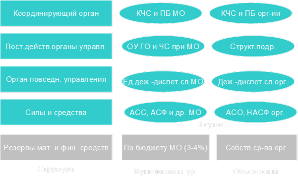 Рис. 2.1 Структура гражданской обороны Российской Федерации Как видно из рисунка 2.1., руководство ГО в министерстве, ведомстве, учреждении и предприятии, независимо от форм собственности, осуществляют их руководители, которые по должности являются начальниками ГО. Органами, осуществляемыми управление ГО, являются: - федеральный орган исполнительной власти, специально уполномоченный на решение задач в области ГО (МЧС России), и его территориальные органы, созданные в установленном порядке; - структурные подразделения федеральных органов исполнительной власти, специально уполномоченные на решение задач в области ГО (штабы, отделы, управления по ГО и ЧС); - структурные подразделения организаций, специально уполномоченные на решение задач в области ГО, создаваемые в порядке, установленном Правительством РФ. Для непосредственного выполнения мероприятий ГО создаются службы ГО, а также силы и средства ГО, включающие военизированные и невоенизированные формирования. Служба и силы гражданской обороны.Служба гражданской обороны - служба, предназначенная для проведения мероприятий по гражданской обороне, включая подготовку необходимых сил и средств и обеспечение действий гражданских организаций гражданской обороны в ходе проведения аварийно-спасательных и других неотложных работ при проведении военных действий или вследствие этих действий. Службы ГО функционируют на четырех уровнях: федеральном, территориальном, местном и объектовом. На каждом уровне руководство осуществляют начальники ГО, координацию действий – органы управления по делам ГО, непосредственное руководство – начальники служб ГО. К службам ГО относятся: служба оповещения и связи, охраны общественного порядка, противопожарная, медицинская, аварийно-техническая, убежищ и укрытий, энергетики и светомаскировки, радиационной и химической защиты, материально-технического снабжения и другие. Силами ГО являются воинские формирования, объединенные в войска ГО, а также гражданские организации ГО. Войска ГО – соединения, части, подразделения и организации, укомплектованные военнослужащими, которые подчинены МЧС России и предназначены решать задачи ГО. Являются составной частью сил обеспечения безопасности государства. В военное время руководство осуществляет Верховный главнокомандующий Вооруженными Силами – Президент РФ через Начальника ГО. Непосредственное управление осуществляет Первый заместитель начальника ГО – Министр МЧС России. Гражданские организации гражданской обороны - формирования, создаваемые на базе организаций по территориально-производственному принципу, не входящие в состав Вооруженных Сил РФ, владеющие специальной техникой и имуществом и подготовленные для защиты населения и организаций от опасностей, возникающих при ведении военных действий или вследствие этих действий. 2.2 Единая государственная система предупреждения и ликвидации чрезвычайных ситуаций (РСЧС) Единая государственная система предупреждения и ликвидации чрезвычайных ситуаций (РСЧС) объединяет органы управления, силы и средства федеральных органов исполнительной власти, субъектов РФ, местного самоуправления, организаций, в полномочия которых входит решение вопросов по защите населения и территорий от ЧС. Основными задачами РСЧС являются: ¾ разработка и реа