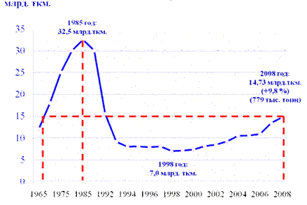 Динамика объема грузоперевозок за период 1963-2008 гг. показана на рис.2.
