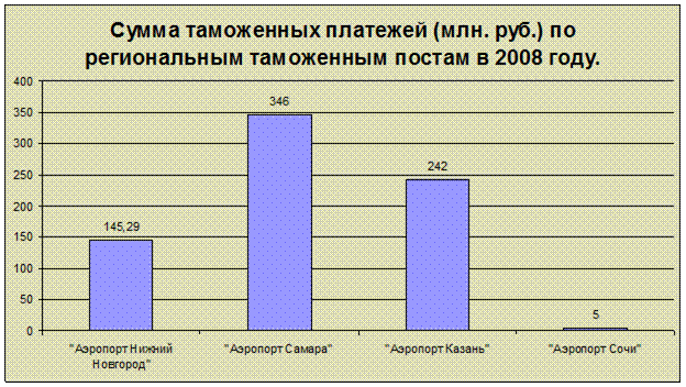 Рис. 3.6. Сравнение суммы таможенных платежей (млн. руб.) на региональных таможенных постах в 2008 году. Таможенный пост «Аэропорт Нижний Новгород» занимает 3 место, среди рассмотренных региональных таможенных постов, лидирующее же положение принадлежит таможенному посту «Аэропорт Самара». Таким образом, мы можем сделать вывод, что в товарообороте таможенного поста «Аэропорт Нижний Новгород» преобладают более мелкие партии товаров и участвует большее количество участников ВЭД. Это обусловлено тем, что количество международных рейсов предельно мало и представлено в основном сезонными полетами отдыхающих, а также отсутствием полностью грузовых перевозок. В первой главе ВКР Изучены особенности осуществления международных воздушных перевозок товаров и проведен анализ понятийного аппарата системы международных воздушных перевозок. Основными сферами использования воздушного транспорта являются внутренние и международные перевозки пассажиров на дальние расстояния, доставка срочных и дорогостоящих грузов, а также транспортное обслуживание территорий, лишенных других видов транспорта. Международные авиаперевозки — область важных экономических интересов как государства, так и перевозчика. Международная перевозка регулируется специальными нормами международного воздушного права, унифицированными нормами, коллизионными нормами международного частного права, а также законами и правилами национального воздушного законодательства. Российские авиаперевозчики сегодня испытывают значительные трудности из-за отработки назначенных ресурсов и календарных сроков службы воздушных судов, а также из-за несоответствия их вводящимся международным нормам. По прогнозам к 2010 году можно ожидать вывода из эксплуатации около 70 % гражданских воздушных судов РФ. Во второй главе ВКР рассмотрены действующие технологии таможенного оформления товаров, перемещаемых воздушным транспортом. Таможенное оформление перемещения товаров и транспортных средств является совокупностью таможенных операций, осуществляемых лицами и таможенными органами, в отношении товаров и транспортных средств, перемещаемых через таможенную границу, то есть – это процедура помещения товаров и транспортных средств под определенный таможенный режим и завершение действия данного режима в соответствии с требованиями и положениями ТК РФ, в тоже время таможенное оформление является совокупностью операций, производимых должностными лицами таможни в целях обеспечения таможенного контроля за перемещением через российскую таможенную границу товаров и транспортных средств и применения средств государственного регулирования такого перемещения. Таможенное оформление включает в себя следующие этапы: таможенные операции и процедуры, предшествующие подачи таможенной декларации (прибытие товаров и транспортных средств на таможенную территорию РФ; доставка товаров и транспортных средств с места пересечения таможенной границы до места прибытия); внутренний таможенный транзит; помещение товаров на временное хранение; таможенное декларирование товаров; таможенные операции и процедуры, осуществляемые после завершения таможенного декларирования товаров: при убытии товаров с таможенной территории РФ; при условном выпуске товаров, с соблюдением определе