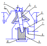 Конусная ≈40% парка. Кл – ция: 1. По технологическому назначению: крупного, среднего и мелкого дробления. 2. По роду привода: С односторонним, двусторонним, гидродинамическим, инерционным и непосредственно от эл. двигателя КМД 3. По характеру движения подвижного конуса: С круговым качательным и поступательным движениями. 4: По наличию амортизирующего устройства: С пружинным и гидравлическим устройством, и без него. Принцип действия: разрушение материала происходит по действием сил трения материала между подвижным и неподвижным конусами. Привод от эл. двигателя и конусно зубчатой передачи или гидравлический. Пример ККД 1500/180, где 1500- ширина приёмной щели, 180 - ширина разгрузочного отверстия. 1. приёмная воронка; 2. неподвижн. конус; 3. подвижн. конус; 4. вал; 5. предохранит устройство; 6. Бронзов. втулка; 7. приводной вал; 8. зубч. передача; 9. эксцентриковый стакан; 10. сферический подпятник. «+» - меньшее энергопотребление; высока степень дробления. «-» - большая высота конструкции.