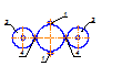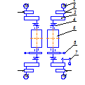 Рис.1 1-шестерня насаженная на вал двигат., 2-паразитные шестерни, 3-зубчатые венцы, 4-синхронизирующая и разделяющая шестерня, 5-гидроцилиндр (выводит шестерню из зацепления), 6-квадратные окна для вывода хвостовиков нажимных устройств. Рис.2