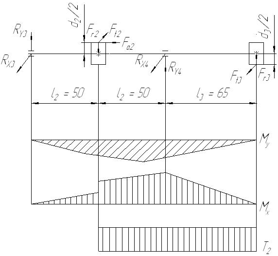 Рис. 3 3.4 Определение опорных реакций вала Рассмотрим промежуточный вал редуктора. Реакции опор (рис. 4): в плоскости xz: Rx3 = (Ft3l3 + Ft2l2)/2l2 = (5872·65 + 2806·50)/2·50 = 5220 Н; Rx4 = [( Ft2l2 - Ft3 (2l2 + l3)] /2l2 = ( 2806·50 - 5872·165)/2·50 = - 8286 Н; Проверка: Rx3 + Rx4 + Ft3 - Ft2 = 5220 - 8286 + 5872 – 2806 = 0. в плоскости yz: Ry3= (Fr2l2 - Fa2d2/2 + Fr3l3)/2l2 = (1038·50 - 508·201/2 + 2137·65)/2·50 = 1398 H; Ry4= (-Fr2l2 - Fa2d2/2 + Fr3(2l2 + l3))/2l2 = (-1038·50 - 508·201/2 + 2137·165) /2·50 = 2497 H;