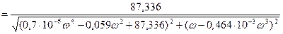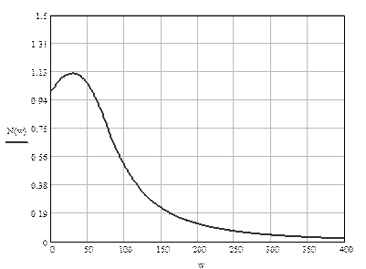 Рис. 2.3. График ошибки и ее установившейся составляющей при подаче сигнала с постоянной скоростью Вынужденный режим устанавливается на уровне вхождения графика Границы интервала [0,098;0,108]. Время установления вынужденного режима: tв = 0,313 с. Время установления вынужденного режима при воздействии сигнала с постоянной скоростью (tв = 0,313 с) больше времени регулирования (tр = 0,106 с). 2.3.1 Определение частоты Запишем выражение для АЧХ по выходу УМ и построим график (рис. 2.4):
