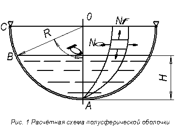 Рис. 1. Схема оболочки Выполнение расчёта 1. Выводы расчётных зависимостей для верхней полусферы В верхней полусфере отсечём часть оболочки нормальным коническим сечением с углом