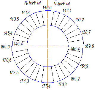 По данным таблиц строим эпюры погонных усилий. Схема эпюры приведена на рис. 4. С помощью эпюры определяем наиболее напряжённое сечение оболочки и максимальные усилия