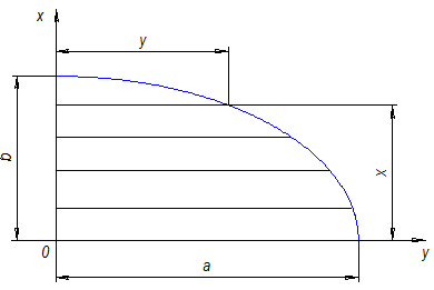 Меньшую полуось b разбиваем на 5 равных частей, для каждого сечения производим расчёты, результаты расчётов заносим в таблицу 1. Таблица 1