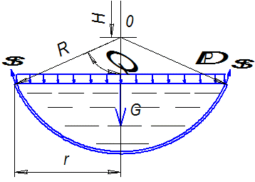 Рис. 3. Расчётная схема Отсечём нормальным коническим сечением часть сферы (рис. 3). Вес жидкости в объёме шарового сегмента