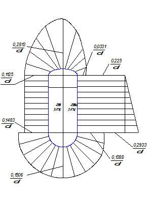 где x, y – координаты точки в рассматриваемом сечении оболочки. Для построения эпюр задаёмся значениями x. Координату y определяем из уравнения эллипса