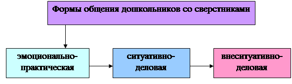 Рисунок 1 – Схема возникновения межличностных отношений дошкольниковЭмоционально-практическая форма общения побуждает детей проявлять инициативу, влияет на расширение спектра эмоциональных переживаний. Ситуативно-деловая создает благоприятные условия для развития личности, самосознания, любознательности, смелости, оптимизма, творчества. Внеситуативно-деловая формирует умение видеть в партнере по общению самоценную личность, понимать его мысли и переживания. В то же время она позволяет ребенку уточнить представления о самом себе [45,с.62] К 2 годам складывается первая форма общения со сверстниками – эмоционально-практическая. Новая потребность в общении со сверстниками занимает четвертое место вслед за потребностью в активном функционировании, общении со взрослыми и в новых впечатлениях. Содержание ее состоит в том, что ребенок ждет от сверстника соучастия в своих шалостях, забавах и стремится к самовыражению. Общение сводится к беготне, веселым крикам, забавным движениям и отличается раскованностью и непосредственностью. Детей привлекает сам процесс совместных действий: сооружение построек, убегание и пр. Именно в процессе и заключается для малыша цель деятельности, а результат ее не важен. Мотивы такого общения заключаются в сосредоточенности детей на самовыявлении. Хотя малыш стремится подражать ровеснику и возрастает интерес детей друг к другу, образ ровесника для ребенка очень нечеткий, потому что их совместные действия поверхностны [45,с.63]. Общение с товарищами сводится к отдельным эпизодам. Дети долго играют одни. А для установления контактов широко используют все действия, которыми овладели в общении с взрослыми - жесты, позы, мимику. Эмоции ребят очень глубоки и интенсивны. Предметно-действенные операции тоже вносят свой вклад в установление контактов. На 4-м году жизни все большее место в общении занимает речь. В возрасте с 4 до 6 лет у дошкольников наблюдается ситуативно-деловая форма общения с ровесниками. В 4 года потребность общения со сверстниками выдвигается на одно из первых мест. Это изменение связано с тем, что бурно развиваются сюжетно-ролевая игра и другие виды деятельности, приобретая коллективный характер. Дошкольники пытаются наладить деловое сотрудничество, согласовать свои действия для достижения цели, что и составляет главное содержание потребности в общении [45,с.64]. Стремление действовать совместно настолько сильно выражено, что дети идут на компромисс, уступая друг другу игрушку, наиболее привлекательную роль в игре и т.д. У детей ярко проявляется склонность к конкуренции, соревновательность, непримиримость в оценке товарищей. На 5-м году жизни дети постоянно спрашивают об успехах товарищей, требуют признать собственные достижения, замечают неудачи других детей и пытаются скрыть свои промахи. Дошкольник стремится привлечь внимание к себе. Ребенок не выделяет интересов, желаний товарища, не понимает мотивов его поведения. И в то же время проявляет пристальный интерес ко всему, что делает сверстник. Дети используют разнообразные средства общения, и несмотря на то, что они много говорят, речь остается по-прежнему ситуативной [45,с.65]. Внеситуативно-деловая форма общения наблюдается довольно редко, у небольшого числа детей 6-7 лет, но у старших дошкольников четко намечается тенденция к 