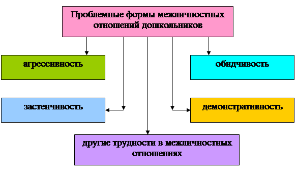 Рисунок 2 – Проблемные формы межличностных отношений дошкольниковСреди психологических особенностей, провоцирующих агрессивное поведение, обычно выделяют недостаточное развитие интеллекта и коммуникативных навыков, сниженный уровень произвольности, неразвитость игровой деятельности, сниженную самооценку, нарушения в отношениях со сверстниками. Однако остается неясным, какие именно из этих особенностей в наибольшей мере влияют на агрессивность детей [45,с.81]. В основе детской агрессивности может лежать различная мотивационная направленность: - спонтанная демонстрация себя; - достижение своих практических целей; - подавление и унижение другого. Однако, несмотря на эти очевидные различия, всех агрессивных детей объединяет одно общее свойство – невнимание к другим детям, неспособность видеть и понимать другого. Обидчивость. В общих чертах обиду можно понимать как болезненное переживание человеком игнорирования или отвержения со стороны партнеров по общению. Это переживание включено в общение и направлено на другого. Явление обиды возникает уже в дошкольном возрасте [45,с.83]. Маленькие дети (до 3-4 лет) могут расстраиваться из-за отрицательной оценки взрослого, требовать внимания к себе, жаловаться на сверстников, но все формы детской обиды носят непосредственный, ситуативный характер - малыши не застревают на этих переживаниях и быстро забывают их. Феномен обиды во всей своей полноте начинает проявляться после 5 лет, что связано с появлением в этом возрасте потребности в признании и уважении - сначала взрослого, а потом и сверстника. Именно в этом возрасте главным предметом обиды начинает выступать сверстник, а не взрослый. Обида на другого проявляется в тех случаях, когда ребенок остро переживает ущемленность своего Я, свою непризнанность, незамеченность. Для проявления обиды характерна подчеркнутая демонстрация своей «обиженности». Обиженный всем своим поведением показывает обидчику, что он виноват и ему следует просить прощения или как-то исправиться. Он отворачивается, перестает разговаривать, демонстративно показывает свои «страдания» [45,с.86]. Поведение детей в состоянии обиды имеет интересную и парадоксальную особенность. С одной стороны, это поведение носит явно демонстративный характер и направлено на привлечение внимания к себе. С другой – дети отказываются от общения с обидчиком: молчат, отворачиваются, уходят в сторону. Отказ от общения используется как средство привлечения внимания к себе, как способ вызывания чувства вины и раскаяния у того, кто обидел. Такая демонстрация своих переживаний и подчеркивание вины обидчика является спецификой данного феномена, которая явно отличает его от агрессивных форм поведения. Установка на оценочное отношение к себе у обидчивых детей проявляется в различных показателях отношения к сверстникам - в характере их восприятия, в особенностях самооценки и ожидаемой оценки товарищей, в интерпретациях конфликтных ситуаций и способах выхода из них [45,с.87]. Застенчивость является одной из самых распространенных и самых сложных проблем межличностных отношений. Известно, что застенчивость порождает ряд существенных трудностей в общении людей и в их отношениях. Среди них такие, как проблема познакомиться с новыми людьми, отрицательные эмоциональные состояния в ходе общ