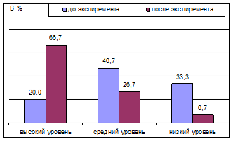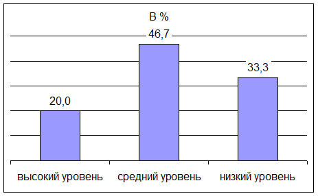 И так, из таблицы видно, что с высоким уровнем коммуникаций 3(20,0%) детей, с низким 5(33,3%) дошкольников и 7(46,6%) дошкольников имеют средний уровень коммуникативных способностей. Результаты диагностики коммуникативных способностей представлены в динамике рисунок 4. Полученные показатели коммуникативных способностей в ходе констатирующего эксперимента для дошкольников возраста 6-7 лет очень низкие, так как в этом возрасте при правильном развивающем обучении дети более общительны.