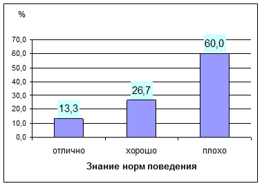 Рисунок 4 – Уровень коммуникативных способностей дошкольниковКак видим из рисунка 4, в основном дошкольники малообщительны (средний уровень), что не может не повлиять на возникновение конфликтов между дошкольниками. Следовательно либо педагог мало уделяет внимания развитию коммуникативных способностей, либо не правильно подобраны методики занятий с дошкольниками. Опрос – беседа «Знание норм поведения» (Приложение Б) Цель: выяснить знание норм поведения во взаимоотношениях. В беседе детям было предложено выслушать рассказ и найти ошибки в поведении мальчика Миши, который также ходит в детский сад. В рассказе содержится 5 ситуаций. Выслушав рассказ, ребенок вместе с экспериментатором выделяет ситуации в рассказе и самостоятельно определяет ошибки в поведении Миши. Дети должны дать ответы на вопросы: 1) Что по-твоему рассказал ей Миша? 2) Какие поступки мальчика тебе не понравились? 3) Как поступил бы на его месте ты? Знания оценивались по пятибальной шкале: - за все правильные ситуации – 5; - за 3 и более ситуации – 4; - за 2 ситуации – 3; - за 1 ситуацию – 2. Из 15 детей, принимавших участие в эксперименте, верно, оценили все неправильные поступки Миши 12 (42,8%) ребят. Определили как неправильные четыре поступка – 8 (28,6%) ребят. Выделили две ситуации 6 (21,4%) детей с неправильными поступками («пролил молоко и не извинился», «не помог убирать игрушки») и 2 (7,2%) – выделили одну ситуацию с пролитым молоком и оценили как неверное поведение в ней лишь то, что Миша вертелся за столом. Таким образом, дети не очень хорошо знакомы с нравственными нормами. На вопрос – «как бы ты поступил?» в каждой из найденных ситуаций с ошибками в поведении Миши дети правильно подобрали варианты нравственного поведения: 1)«здороваться нужно с каждым воспитателем и работником детского сада» - 12 (42,8%); 2)«нужно на вежливую просьбу давать игрушку другу, но попросить его не ломать ее» – 12 (42,8%); 3)«нужно на вежливую просьбу давать игрушку другу» 8 (28,6%); 4)«за столом нельзя вертеться, а если пролил молоко – необходимо извиниться за свой поступок» - 12 (42,8%), «за столом нельзя вертеться» (про извиниться – не сказал) – 1 (3,57 %); 5)«сердиться на Машу после того, как облил ей молоком платье – неправильно, нужно было искренне извиниться за свой поступок, и девочка перестала бы сердиться на Мишу» – 12 (42,8%) чел. 6)«сердиться на Машу после того, как облил ей молоком платье – неправильно» - 8 (28,6%); 7)«нельзя отказываться на вежливую просьбу помочь собирать игрушки воспитательнице, ведь она сама в них не играет, а помогать воспитательнице во всем и наводить порядок в группе должен каждый, ведь мы уже большие и можем помогать» – 12 (42,8%) чел. и 1 (3,57%) ребенок сказал, что наводить порядок должны взрослые. Для вывода этих показателей в сравнительный анализ была составлена диаграмма по результатам ответов (рисунок 5).
