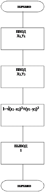 Рисунок 1.1 – Схема программы В программе используются следующие типы данных заданные пользователем: REAL: x1 , x2 , y1 , y2 , l– значения координат точек, расстояние между нимим. Программа предполагает, что пользователь введет координаты точек из диапазона вещественных данных (т.е. REAL)