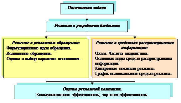 Рис. 1.2. Схема организации рекламной кампании [Сост.авт.] Главная задача планирования — определить, как будет доноситься рекламное послание до потребителя: в какой форме, с помощью каких средств массовой информации и в рамках какого бюджета.Целью рекламной кампании является достижение определенного коммуникационного эффекта у контактируемой с рекламным сообщением аудитории и побуждение ее к целевому поведению. Главное - постоянно контролировать степень эффективности кампании, и вовремя корректировать ее. В целом вся рекламная кампания укладывается в классическую схему: планирование - организация - мотивация - контроль. 1.3 Основные методы исследования эффективности рекламы Исследования эффективности рекламы - одно из важных и перспективных направлений современных маркетинговых исследований. Проведение исследования рекламы обусловлено, прежде всего, тем, что решения в области рекламной деятельности принимаются в условиях риска и неопределенности. Перед разработчиками рекламы практически всегда стоят вопросы типа: “Правильно ли выбраны целевые рынки и целевая аудитория? Действительно ли мы правильно понимаем запросы потребителей? Те ли люди смотрят телевизионную рекламу из числа тех, на кого она ориентирована? Оказала ли реклама какое-то влияние на объем продаж?” На эти и другие подобные вопросы очень часто ищутся ответы путем проведения соответствующих исследований. Характеризуя содержание маркетинговой рекламной деятельности можно выделить следующие направления исследования рекламы: · Исследование эффективности и популярности отдельных рекламных средств (носителей рекламы) для разных целевых аудиторий. В частности, на основе изучения степени популярности отдельных радио и телепередач в средствах массовой информации. · Изучение эффективности рекламной политики фирмы в целом. Изучается степень осведомленности о фирме и ее товарах по результатам рекламной деятельности за определенный период времени. · Исследование эффективности отдельных рекламных кампаний, в том числе на основе проведения специальных экспериментов. Часто устанавливается контрольный район, где рекламная кампания не проводится, и опытный район, в котором осуществляется рекламная кампания. Сравнительная оценка для разной целевой аудитории осуществляется в направлении изучения степени знакомства потребителей с рекламируемым товаром и желания его купить. · Исследование эффективности воздействия рекламного обращения на аудиторию, степени его влияния на поведение людей. · Изучение синергетического эффекта от совместного использования в рекламных целях нескольких средств массовой информации. Эти исследования, прежде всего, направлены на повышение эффективности рекламной деятельности, снижения риска ее проведения, лучшее использование финансовых средств. Под эффективностью рекламы понимают способность воздействовать на целевую аудиторию таким образом, как это задано производителем товаров услуг. Эффективность рекламных средств характеризуется числом охваченных потребителей, яркостью и глубиной впечатлений, степенью привлечения внимания. Данные об эффективности рекламной кампании можно получить разными путями, их выбор будет зависеть от требований к глубине, точности и детальности отчета. Среди методов анализа можн