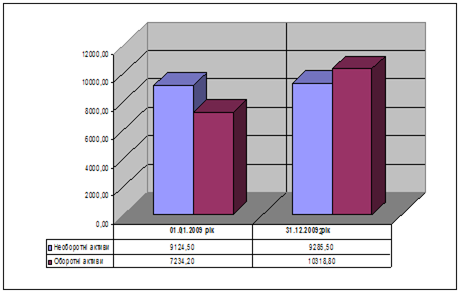 З таблиці 2.13 видно, що за аналізований нами період зросла загальна вартість майна підприємства, на 3245,60 тис. грн. за підсумками 2009 року У структурі сукупних активів підприємства спостерігаються коливання питомої ваги необоротних активів, 55,78% на початок 2009 року і зменшення до 47,36% на кінець 2009 року. Вартість необоротних активів збільшилась на 161,00 тис. грн.. Вартість оборотних активів збільшилась на 3084,60 тис. грн. в 2009 році, при цьому збільшилась на 8,41% їх частка в загальній структурі активів.