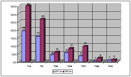 По даним таблиці 2.3 ми бачимо, що дохід від реалізації продукції в 2008 році склав 9090,90 тис. грн. , що на 4451,50 тис. грн. менше ніж в 2007 році. (13542,40 тис. грн.). Темп росту зменшився на 32,87%. Податок на додану вартість в 2007 році склав 2108,20 тис. грн., що відповідало 15,57% виручки від реалізації. В 2008 році сума податку зменшилась на 593,20 тис. грн. (темп росту зменшився на 2,14%) і склала 1515,00 грн., питома вага в структурі збільшилася на 1,10% і склала 16,67%. У 2007 році чистий дохід від реалізації був зафіксований на рівні 11424,20 тис. грн. при питомій вазі статті 84,36%. В 2008 році зміна в абсолютних величинах склала 3848,30 тис. грн. (темп росту зменшився на 33,69%), таким чином, сума по статті склала 7575,90 тис. грн. Питома вага в структурі зменшилася на 1,02% і склала 83,33%. Можна затверджувати про негативний розвиток підприємства за даний період, оскільки темп росту чистої виручки менший за темп росту собівартості від реалізації продукції (66,31% і 84,72% відповідно). Собівартість реалізованої продукції в 2007 році склала 6531,40 тис. грн., питома вага 48,23%. В 2008 році собівартість реалізованої продукції зменшилась на 998,10 тис. грн. і склала 5533,30 тис. грн., питома вага збільшилась і склала 60,87%, темп росту зменшився на 15,28%. Валовий прибуток в 2007 році склав 4892,80 тис. грн., при питомій вазі у виручці 36,13%. В 2008 році валовий прибуток зменшився і склав 2042,60 тис. грн., зменшення склало 2850,20 тис. грн., питома вага також зменшилася на 13,66% і склала 22,47%, темп росту зменшився на 58,25%. Адміністративні витрати в 2008 році склали 541,30 тис. грн., що на 50,70 тис. грн. більше ніж в 2007 році (490,60). Їх питома вага в 2007 році скала 3,62%, а в 2008 році збільшилася на 2,33% і склала 5,95%. Темп росту адміністративних витрат збільшився на 10,33%. Темп росту витрат на збут збільшився на 288,24% або на 39,20 тис. грн. Їх питома вага в загальній структурі фінансових результатів в 2007 році склала 0,10%, що на 0,48% менше, ніж питома вага в 2008 році (0,58%). У 2007 році інші операційні витрати склали 202,00 тис. грн., їх питома вага у виручці від реалізації була зафіксована на відмітці в 1,49%. В 2008 році інші операційні витрати скоротилися на 55,40 тис. грн. і склали 146,60 тис. грн. при питомій вазі у виручці від реалізації 1,61%, яка збільшилася на 0,12%. Фінансовим результатом від операційної діяльності підприємства в 2007 році став прибуток у розмірі 4192,50 тис. грн., питома вага складала 30,96%, в 2008 році в підприємства значно зменшився прибуток від операційної діяльності на 2870,60 і складав 1321,90 тис. грн., (темп росту зменшився на 68,47%). Питома вага цієї статті в 2008 році склала 14,54%. По статті інші фінансові доходи ми бачимо тенденцію підвищення. В 2007 році вони склали 156,60 тис. грн., при питомій вазі 1,16%, а в 2008 році – 193,00 тис. грн., при питомій вазі 2,12, що на 36,40 тис. грн. більше. Темп росту інших фінансових доходів збільшився на 23,24%. Інші доходи в 2007 році склали 52,10 тис. грн., при питомій вазі у виручці від реалізації 0,38%. В 2008 році ця сума збільшилась на 94,10 тис. грн. і склала 146,20 тис. грн., питома вага також збільшилась на 1,22% і склала 1,61%. Негативним моментом є збільшення фінансових витрат на 99,61%, що може негативно відобразитись на результатах від операційної діяльності підприємства в майбутньому. Фінансові витрати в 2007 році були зафіксовані на рівні 154,60 тис. грн., а в 2008 році вони складали 308,60 тис. грн. Інші витрати в 2007 році склали 132,90 тис. грн., питома вага 0,98%. В 2008 році ці витрати збільшилися на 173,90 тис. грн. і склали 306,80 тис. грн. (темп