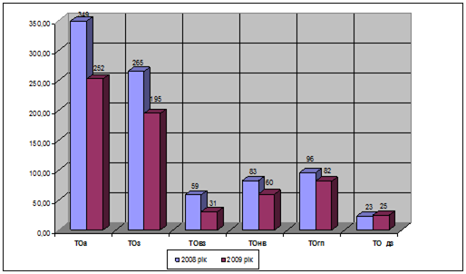 Рис. 2.10 Динаміка змін тривалості обороту основних показників ділової активності ТОВ «Нива» за 2008 рік. З рисунка 2.10 наглядно видно, що тривалість одного обороту по всіх основних показниках ділової активності в 2008 році в порівнянні з 2007 роком зростає, що негативно відображається на результатах діяльності підприємства. Таблиця 2.30 Аналіз ділової активності ТОВ «Нива» за 2008 –2009 роки.