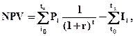 Различие заключается только в определении фактора i, который в формуле сложных процентов является процентной ставкой, а в формуле коэффициента дисконтирования – ставкой дисконта или нормативом дисконтирования. При осуществлении кредитно-банковских операций следует различать ставки, по которым выплачивает процент коммерческий банк своим кредиторам, и ставки, под которые банк дает ссуды инвесторам. Банковский процент представляет собой процентную ставку, или цену, которую выплачивает банк собственнику финансовых ресурсов за временное пользование последними. Собственник капитала предоставляет банку в пользование свои ресурсы, помещает их на депозит, за что банк начисляет проценты по депозитной ставке. Ставка платы за кредит – это цена кредита, которую уплачивает банку пользователь этого кредита. Эта ставка по своей величине больше ставки банковского процента на величину банковской маржи. Чистая текущая стоимость – Net Present Value (NPV) представляет собой разность между приведенной суммой поступлений (Pt) за расчетный период и суммарной величиной инвестиций (I), приведенных к одному моменту времени. По своей сути это есть интегральный экономический эффект.