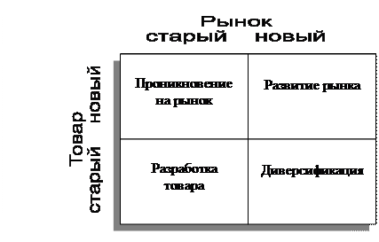 Рис.1. Стратегическое планирование маркетинга 2.1 . СТРАТЕГИЯ МАРКЕТИНГА. Стратегиямаркетинга определяет, как нужно применять структуру маркетинга, чтобы привлечь и удовлетворить целевые рынки и достичь целей организации. В решениях о структуре маркетинга главное - планирование продукции, сбыт, продвижение и цена. Стратегия должна быть максимально ясной.. (Например, планирование новой продукции должно предусматривать установление приоритетов, распределение ответственности, временной и производственный графики, поддержку продвижения и потребности в обучении персонала.) Вот пример плохой, нечеткой стратегии: для того чтобы увеличить долю на рынке для товара 4, дополнительные средства будут выделены на дизайн и рекламу. Хорошая стратегия той же организации должна показать более четкие направления деятельности. Доля на рынке товара 4 должна быть увеличена с 6 до 8 % в течение 12 месяцев посредством разработки привлекательной и функциональной упаковки; усиленной рекламой для привлечения 200 основных потребителей, изменения реконструкции товара для улучшения его внешнего вида без увеличения издержек. Часто фирма выбирает стратегию из двух и более возможных вариантов. Например, компания, которая хочет увеличить свою долю на рынке до 40%, может сделать это несколькими путями: создать более благоприятный образ товара через интенсивную рекламу; увеличить численность торгового персонала; представить новую модель; понизить цены и продавать через большое число розничных магазинов; Эффективно объединить и скоординировать все эти элементы маркетинга. Каждая из альтернатив открывает различные возможности для маркетологов. Например, ценовая стратегия может быть очень гибкой, поскольку цены менять легче, чем создавать различные модификации товара. Однако стратегию, базирующуюся на низких ценах, легче всего скопировать. Кроме того, удачная ценовая стратегия может привести к ценовой войне, которая очень плохо подействует на чистую прибыль. В отличие от этого стратегию, основанную на преимуществах размещения, трудно копировать в силу длительных сроков аренды и недоступности подходящих мест для конкурентов. Но она может быть негибкой и плохо адаптироваться к изменениям окружающей среды. Четыре подхода к планированию стратегии представлены в следующих подразделах: матрица возможностей по товарам/рынкам, матрица "Бостон консалтинг груп", воздействие рыночной стратегии на прибыль (PIMS) и общая стратегическая модель Портера (в рамках всех этих подходов организация отдельно оценивает и использует все свои возможности, товары и направления деятельности. На основе этих оценок распределяются усилия и ресурсы компании, а также разрабатываются соответствующие стратегии маркетинга.) 2 . 2 . Матрица возможностей по товарам/рынкам Матрица возможностей по товарам/рынкам предусматривает использование четырех альтернативных стратегий маркетинга для сохранения и/или увеличения сбыта: проникновение на рынок, развитие рынка, разработка товара и диверсификация (рис. 2 )