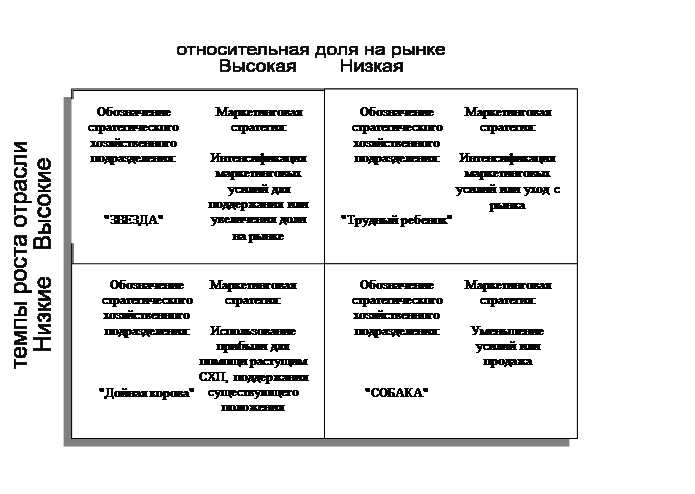 Выбор стратегии зависит от степени насыщенности рынка и возможности компании постоянно обновлять производство. Две или более стратегии могут сочетаться. Стратегия проникновения на рынок эффективна, когда рынок растет или еще не насыщен. Фирма расширить сбыт имеющихся товаров на существующих рынках при помощи интенсификации товародвижения, наступательного продвижения и самых конкурентоспособных цен. Это увеличивает сбыт: привлекает тех, кто раньше не пользовался продукцией данной фирмы, а также клиентов конкурентов и увеличивает спрос уже привлеченных потребителей. Стратегия развития рынка эффективна, если: местная фирма стремится расширить свой рынок; в результате изменения стиля жизни и демографических факторов возникают новые сегменты на рынке; для хорошо известной продукции выявляются новые области применения. Фирма стремится увеличить сбыт существующих товаров на рынках или побудить потребителей по-новому использовать существующую продукцию. Она может проникать на новые географические рынки; выходить на новые сегменты рынка, спрос на которых еще не удовлетворен; по-новому предлагать существующие товары; использовать новые методы распределения и сбыта; сделеть более насыщенными усилия по продвижению. Стратегия разработки товара эффективна, когда фирма имеет ряд успешных торговых марок и пользуется приверженностью потребителей. Фирма разрабатывает новые или модифицированные товары для существующих рынков. Она делает упор на новые модели, улучшение качества и другие мелкие инновации, тесно связанные с уже внедренными товарами, и реализует их потребителям, лояльно настроенным по отношению к данной компании и ее торговым маркам. Используются традиционные методы сбыта; продвижение делает упор на то, что новые товары выпускаются хорошо известной фирмой. Стратегия диверсификации используется для того, чтобы фирма не стала чересчур зависимой от одной ассортиментной группы. Фирма начинает выпуск новых товаров, ориентированных на новае рынки. Цели распределения, сбыта и продвижения отличаются от традиционных для фирмы. 2 . 3 . Матрица "Бостон консалтинг групп" Матрица "Бостон консалтинг групп" позволяет компании классифицировать каждую ассортиментную группу по ее доле на рынке относительно основных конкурентов и темпам годового роста отрасли. Используя матрицу, фирма может определить, во-первых, какое из ее подразделений играет ведущую роль по сравнению с конкурентами и, во-вторых, какова динамика ее рынков: развиваются они, стабилизируются или сокращаются. В основе матрицы лежит предположение, что чем больше доля подразделения на рынке, тем ниже относительные издержки и выше прибыль в результате экономии от масштабов производства, накопления опыта и улучшении позиции при заключении сделок. Матрица выделяет четыре типа подразделений: "звезды", "дойные коровы", "трудные дети" и "собаки" и предполагает стратегии для каждого из них (рис. 3). "Звезда" занимает лидирующее положение в развивающейся отрасли. Основная цель - поддержать отличительное преимущество фирмы в условиях растущей конкуренции. "Звезда" дает значительные прибыли, но требует больших объемов ресурсов для финансирования продолжающегося роста. Долю на рынке можно поддерживать или увеличивать за счет снижения цены, большой объем рекламы, изме