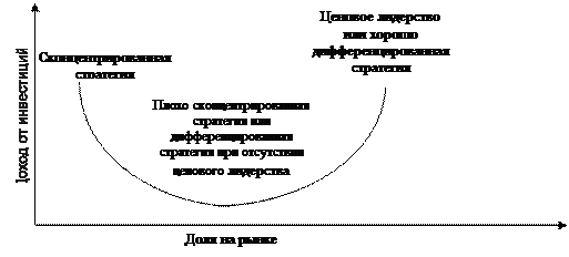Рис. 3. Матрица "Бостон консалтинг групп" Программа воздействия рыночной стратегии на прибыль ( PIMS) , Институтом стратегического планирования, предполагает сбор данных от ряда корпораций для того, чтобы установить взаимосвязь между различными экономическими параметрами и двумя характеристиками функционирования организации: доходом от инвестиций и движением наличных средств. Информация собирается подразделениями и агрегируется по отраслям. Анализируя общие данные по отрасли, организация может определить воздействие различных маркетинговых стратегий на функционирование. Согласно результатам 1983 г. в США на доход сильнее всего влияли следующие факторы, связанные с маркетингом: доля на рынке относительно трех ведущих конкурентов; стоимость, добавленная компанией; рост отрасли; качество продукции; уровень инновации/дифференциации и вертикальная интеграция (обладание последующими каналами сбыта). Что касается движения денежных средств, данные PIMS говорят о том, что растущие рынки требуют от компании средств, относительная высокая доля на рынке улучшает поступление денег, а высокие уровни инвестиций поглощают деньги. Эти выводы весьма схожи с результатами, которые дает матрица "Бостон консалтинг групп". Информация направляется участвующим компаниям в следующих формах: стандартные сообщения - информация о среднем доходе от инвестиций, конкуренции, технологии и структуре издержек; сообщения по анализу стратегий - описание воздействия изменений в стратегии на кратко- и долгосрочный доход от инвестиций и движение наличных средств; сообщения об оптимальных стратегиях - изложение стратегии, максимизирующей результаты; сравнительные сообщения - анализ тактики схожих конкурентов, как удачливых, так и неудачливых. 2 . 4. Общая стратегическая модель Портера Общая стратегическая модель Портера рассматривает две основные концепции планирования маркетинга и альтернативы, присущие каждой из них: выбор целевого рынка (в рамках всей отрасли или отдельных сегментов) и стратегическое преимущество (уникальность или цена). Объединяя эти две концепции, модель Портера идентифицирует следующие базовые стратегии: преимущество по издержкам, дифференциация и концентрация. Используя стратегию преимущества по издержкам, фирма ориентируется на широкий рынок и производит товары в большом количестве. При помощи массового производства она может минимизировать удельные издержки и предлагать низкие цены. Это позволяет иметь более высокую долю прибыли по сравнению с конкурентами, лучше реагировать на рост себестоимости и привлекать потребителей, ориентирующихся на уровень цен. Используя стратегию дифференциации, фирма нацеливается на большой рынок, предлагая товар, который рассматривается как выделяющийся. Компания выпускает привлекательный для многих товар, который тем не менее рассматривается потребителями как уникальный в силу его дизайна, характеристик, доступности, надежности и т. д. В результате цена не играет столь важной роли, и потребители приобретают достаточную лояльность к товарной марке. В рамках стратегии концентрации компания выделяет специфический сегмент рынка через низкие цены или уникальное предложение. Она может контролировать издержки посредством концентрации усилий на нескольких ключевых товарах, предназн