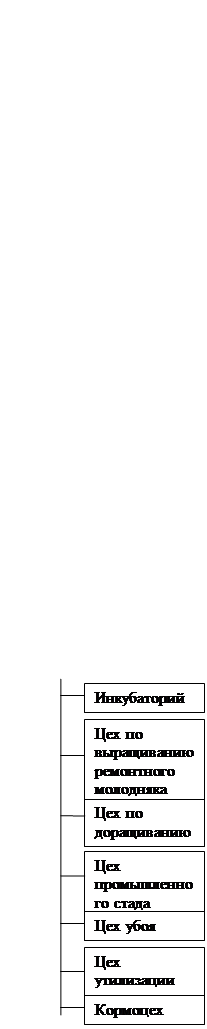 Схема 1. Производственная структура ОАО «Ижевская птицефабрика»Решающее влияние на формирование структуры управления оказывает структура производства, в которой выделяют производственную и организационную структуры. Под производственной структурой понимают количественный состав и пропорции в главных, дополнительных и вспомогательных отраслях предприятия и формы и взаимосвязи на каждой ступени организации производства. Под организационной структурой понимают совокупность подразделений основного, вспомогательного и обслуживающего производств (схема 1, 2). Характеристика экономической службы предприятия: согласно Положению о планово-экономическом отделе оно является самостоятельным структурным подразделением предприятия и подчиняется непосредственно заместителю генерального директора по экономике и финансам. К задачам этого отдела относятся: 1) руководство работой по экономическому планированию на предприятии, направленному на организацию рациональной хозяйственной деятельности, выявление и использование резервов производства с целью достижения наибольшей результативности в деятельности предприятия; 2) организация комплексного экономического анализа деятельности предприятия и участие в разработке мероприятий по эффективному использованию производственных мощностей, материальных и трудовых ресурсов; 3) утверждение внутрипроизводственных планово-расчетных цен; 4) организация финансовой деятельности предприятия, направленной на обеспечение финансовыми ресурсами заданий плана, сохранности и эффективного использования основных и оборотных фондов, трудовых и финансовых ресурсов предприятия; 5) организация труда и заработной платы, результативности использования трудовых ресурсов и правильного расходования фонда оплаты труда. В штате этого отдела три должности: экономист по оплате труда, экономист по анализу хозяйственной деятельности, экономист по хозрасчетам. Основные функции этого отдела: · Организация и общее руководство разработкой проектов перспективных и текущих планов предприятия; · Разработка системы показателей оценки деятельности цехов и служб в соответствии со спецификой их работы; · Организация работы по нормированию и ценообразованию; · Организация разработки мероприятий по эффективному использованию производственных мощностей основных и оборотных фондов, материальных и трудовых ресурсов, по использованию всех резервов производства; · Организация и руководство работой по комплексному, экономическому анализу производственно-хозяйственной деятельности предприятия; · Составление проектов финансовых планов предприятия; · Составление и представление в установленные сроки кредитных заявок в учреждения банков и участие в их рассмотрении; · Обеспечение выполнения кредитного, финансового планов; · Осуществление контроля за завозом ТМЦ с целью предупреждения накапливания сверхнормативных запасов; · Проведение залоговых, лизинговых и других операций; · Осуществление контроля за выполнением финансового и кредитного планов, а также планов по прибыли и рентабельности; · Разработка и внедрение норм затрат труда во всех звеньях производства, обеспечение широкого применения технически обоснованных норм выработки, норм обслуживания для рабочих, специалистов, служащих; · 